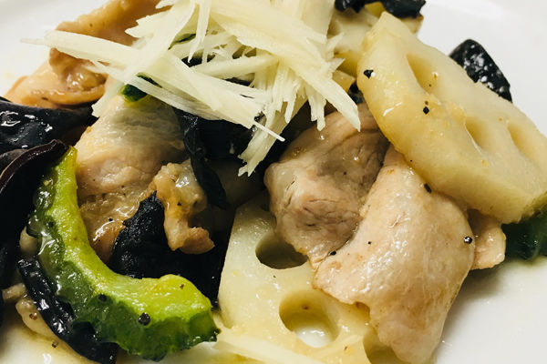 「ゴーヤと蓮根のソテー 新生姜のせ」