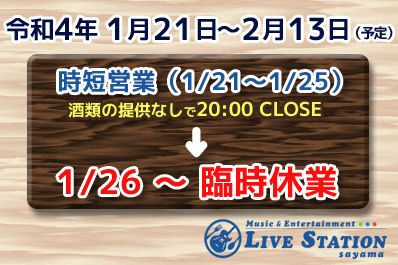 1/21より酒類提供なしで20:00までの時短営業をしておりますが、1/26より2/13(予定)まで臨時休業いたします。