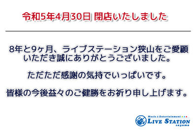 令和5年4月30日の営業をもって閉店いたしました。 8年と9ヶ月、ライブステーション狭山をご愛顧 いただき誠にありがとうございました。 ただただ感謝の気持でいっぱいです。 皆様の今後益々のご健勝をお祈り申し上げます。